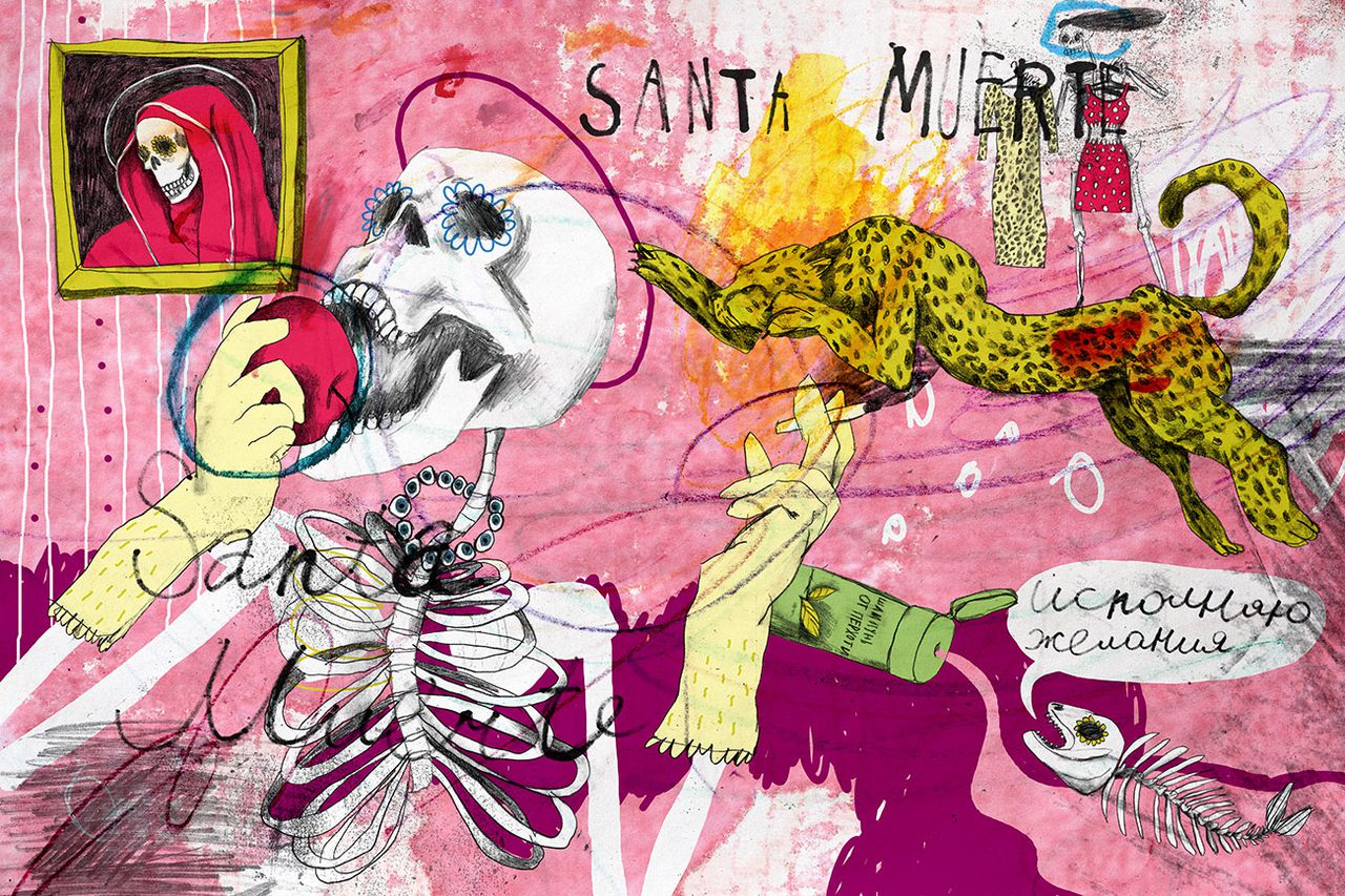 В полдень понедельника я стою среди блеющих коз, визгливых тропических птиц и урчащих шиншилл на главном ведьминском рынке Мехико Сонора. Колоритные сеньоры в расшитых юбках вальяжно расхаживают меж рядов беснующейся живности, выбирая то ли питомца для своих внуков, то ли жертву поупитанней для священных ритуалов. Продвигаюсь в сторону лавок с магическими свечами, куклами вуду и пластиковыми негритянскими младенцами народа йоруба. Наконец, среди чучел нелепо таксидермированных белок и сушёных скатов нахожу её — Санта Муэрте, или Святую Смерть. Десятки статуй разных цветов и размеров, с золочёными косами и в элегантных балахонах. Продавец с энтузиазмом спрашивает меня, что я ищу, но тут же теряет интерес, как только узнает, что на рынок я пришла за информацией. «Мы здесь только торгуем», — отсекает он. В другой лавке меня отсылают в павильон номер сто пятьдесят шесть, в котором работает медиум Святой Смерти, но который я, однако, нахожу закрытым. Девушка по имени Фанни участливо слушает мою отповедь о необходимости распространения славы Санта Муэрте в России, рассказывает мне о месте под названием Тультитлан, где находится главный храм Святой Смерти — место национального и международного паломничества нонконформистов от религии.