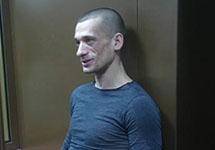 В России художник провел ряд громких акций, в том числе "Свобода" на Малом Конюшенном мосту в Петербурге и "Угроза" с поджогом двери здания ФСБ на Лубянской площади в Москве.