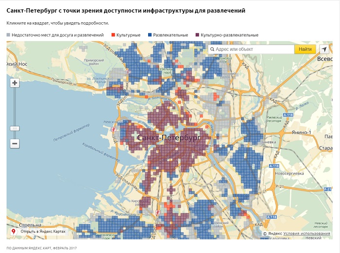 Аналитики «Яндекса» выяснили, какие районы Петербурга наиболее удобны для жизни, а какие — для развлечений. Результаты исследования доступны в виде интерактивных карт.