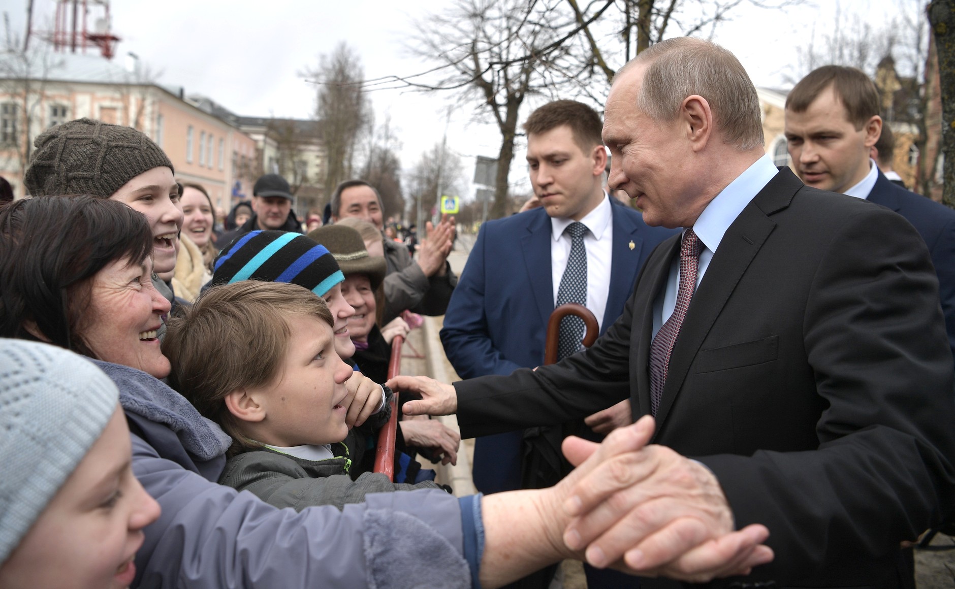 Новгородцы и Владимир Путин. Апрель 2017 kremlin.ru Опросы показывают, что на выборах за Владимира Путина готовы проголосовать 61–66% граждан, а с учетом явки результат может достигнуть и 75% голосов. Причем путинский электорат достаточно равномерно распределен по всем типам населенных пунктов. ФОМ и ВЦИОМ фиксируют наибольший уровень поддержки в сельской местности (65–67%). Самый низкий уровень поддержки (59%) ФОМ отмечает в городах с населением до 50 тысяч человек. Romir — в городах с численностью населения от полумиллиона до миллиона человек. ВЦИОМ пришел к выводу, что до 69% жителей Москвы и Санкт-Петербурга также поддерживают Путина.