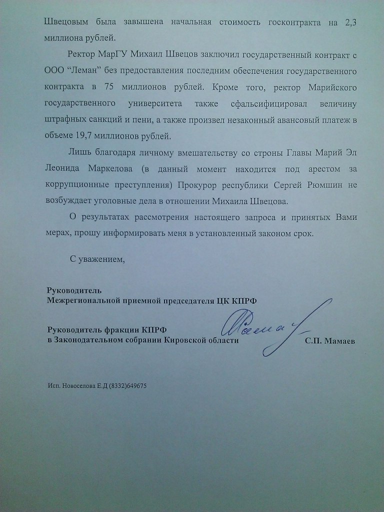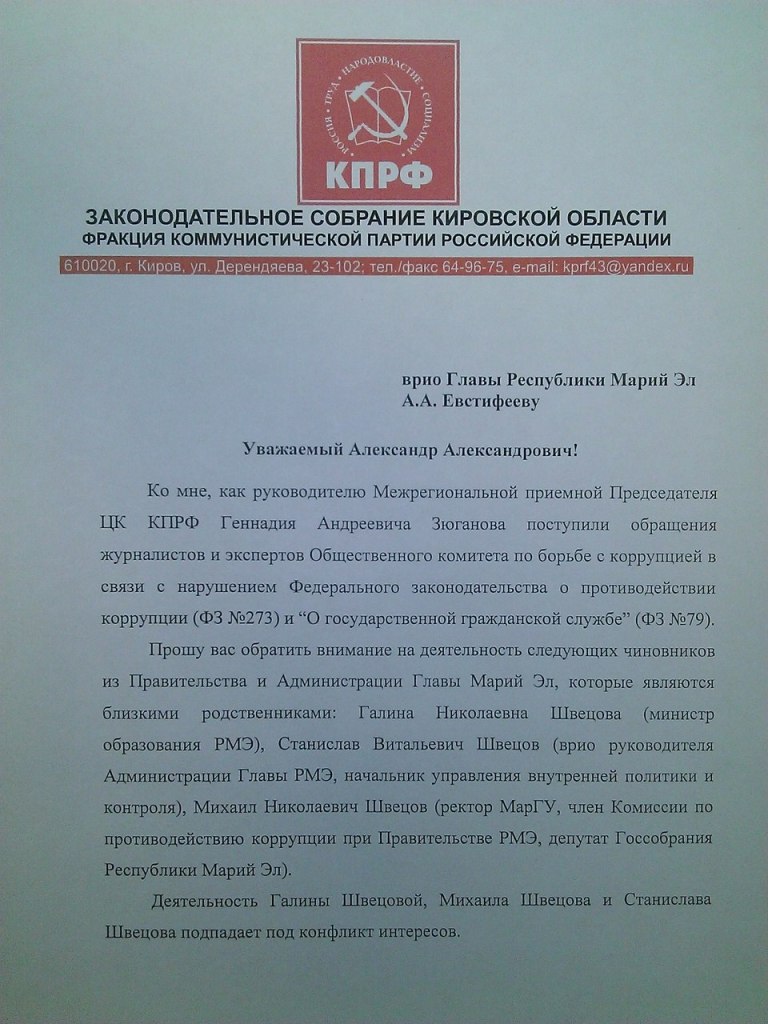 В этой связи советник Геннадия Зюганова и руководитель Межрегиональной приемной Председателя ЦК КПРФ Сергей Мамаев обратился к врио главы Марий Эл Александру Евстифееву в связи с нарушением Федерального законодательства о противодействии коррупции (ФЗ № 273) и «О государственной гражданской службе» (ФЗ № 79).