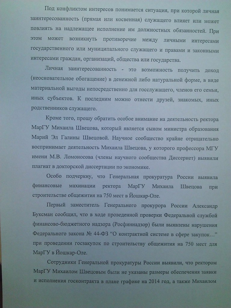 Сергей Мамаев просит обратить внимание на семейный подряд Швецовых, которые занимают высокие должности как в правительстве, так и администрации главы Марий Эл. Это министр образования республики Галина Швецова , врио руководителя администрации главы Марий Эл Станислав Швецов, ректор МарГУ, член комиссии по противодействию коррупции при правительстве РМЭ, депутат Госсобрания Республики Марий Эл Михаил Швецов.