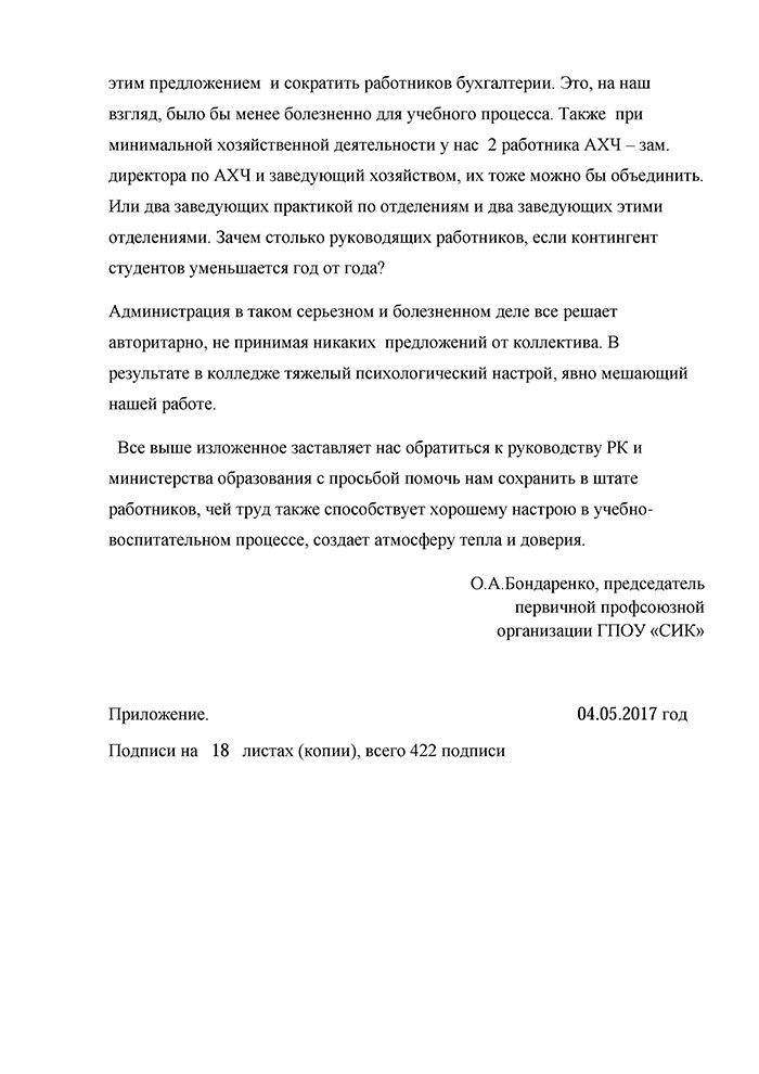 По словам Ольги Бондаренко, после того, как директор учреждения Сергей Филиппов узнал, что сотрудники собирают подписи против сокращений, он организовал собрание. На нем он рассказал, что причина увольнения не в том, что люди плохо работают, а в отсутствии денег у колледжа. Директор думал над этим решением два года и решил, что будет честно, если людей уволят по сокращению штатов и выплатят им при этом выходные пособия.