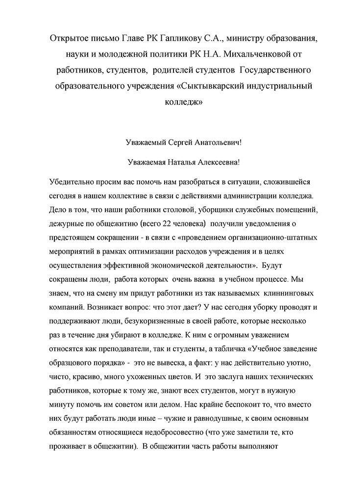 Под письмом 422 подписи, это сами работники, студенты и их родители. Письмо отправили министру образования, науки и молодежной политики Коми Наталье Михальченковой и главе Коми Сергею Гапликову.