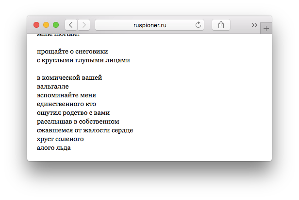 Журнал «Русский пионер» опубликовал стихотворение помощника президента России Владислава Суркова. Произведение «Без объявления весны» рассказывает о двух снеговиках, которые «не покорны весне» и «никуда не бегут и не лезут».