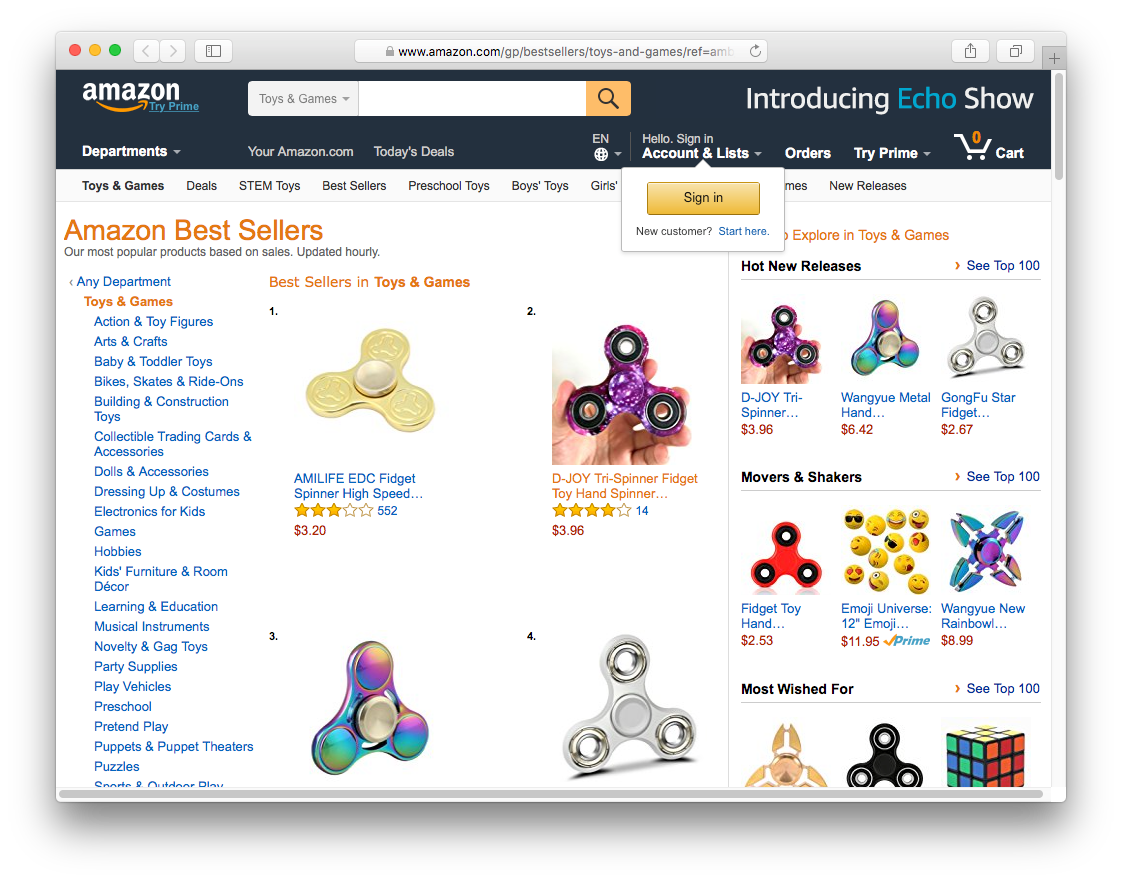 В 2017 году купить спиннеры стало куда проще. На том же Amazon обычные версии теперь стоят два-три доллара, а более дорогие — 10-15. В марте и апреле на YouTube начали массово появляться видео с обзорами спиннеров и трюков, которые можно делать с их помощью (один из трюков — заставить игрушку вращаться на нестандартной поверхности — например, на кончике носа или пальце ноги).