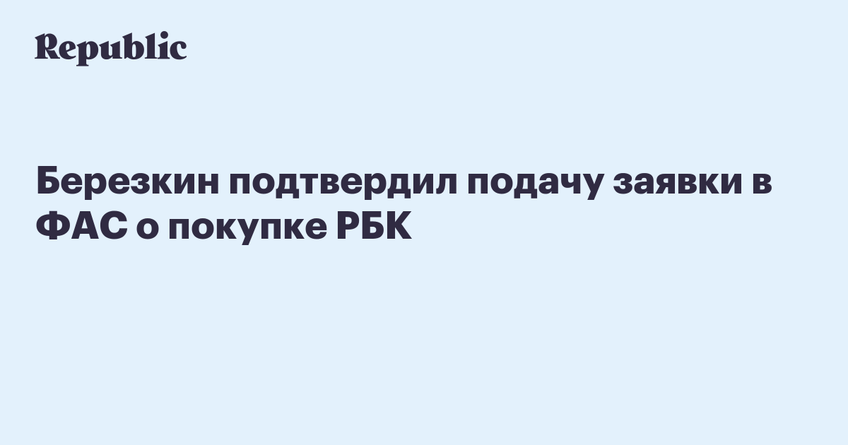 ФАС ранее 10 мая сообщила, что ведомство получило ходатайство о приобретении акций РБК, не назвав потенциального покупателя. Источники Republic указывали, что речь идет о структурах Березкина.