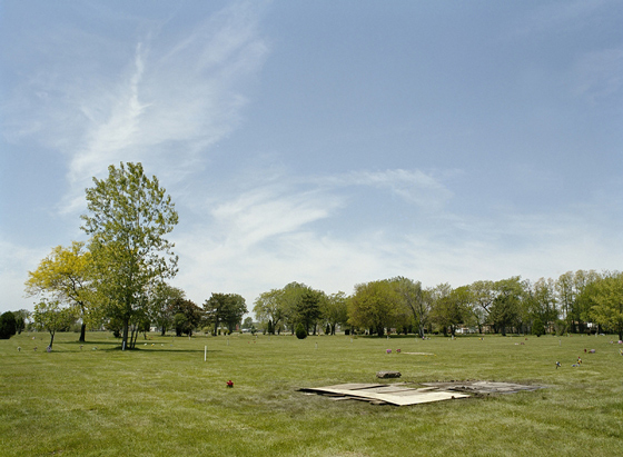 Именно с Эмметта Тилла передо мной стало разворачиваться американское-искусство-изнутри-Америки. Еще до того, как открылась Уитни, я увидела в Чикагском музее современного искусства работу 2005 года местного художника Джейсона Лазаруса, которая называлась «Стоя на могиле Эмметта Тилла, день эксгумации, 1 июня 2005 года». По правде говоря, эта работа выглядела как одна из тысяч постконцептуальных фотографий, которые работают с фронтальным ракурсом, заурядностью пейзажа и архитектуры, индексальностью фотофакта и — отсутствием непосредственного объекта, на место которого приходит собственно место. Но, в конце концов, это просто метод и медиум, как и живопись маслом, а особенной эту работу, как в случае с картиной Шуц, делал Эмметт Тилл, вернее, его тело, историю которого я тогда не знала. Его тело отсутствовало на фотографии, поскольку снят был момент после того, как гроб вынули из могилы (художник вроде бы опоздал на эксгумацию, которую затеяли потому, что в деле появились новые доказательства). В тот момент, когда в медиа снова вспыхнул интерес к этой истории (о которой не то чтобы забывали, особенно черные художники и теоретики визуальной культуры, в 1990—2000-х обращавшиеся к ней снова и снова), это был неожиданный способ говорить о теле Тилла — не возвращаясь к тем ужасным снимкам, собственно, к зрелищу тела.