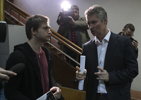 Фото: Россия. Екатеринбург. 4 апреля 2017. Блогер Руслан Соколовский (слева), обвиняемый в оскорблении чувств верующих, и свидетель защиты мэр Екатеринбурга Евгений Ройзман (справа) во время рассмотрения дела в Верх-Исетском районном суде. Р. Соколовский обвиняется в оскорблении чувств верующих и экстремизме после публикации в интернете видеоролика о ловле покемонов в Храме-на-Крови. Донат Сорокин/ТАСС