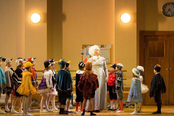 Черняков вводит в спектакль еще одну интригу. Во время песни гусляров Берендей срисовывает портрет Весны с фотографии, выполненной в гомерически смешной недоренессансной эстетике журнала «Крестьянка». И его знаменитая ария «Полна, полна чудес могучая природа», спетая с извиняющимся дребезжанием (а не с традиционным ориентальным шаманизмом), адресована не Снегурочке, а этому самому портрету. Зритель волен додумать что угодно, вплоть до любовной связи Берендея с завучихой Весной. Которая рифмуется с фиксацией Снегурочки на Леле и как бы демонстрирует возможный благополучный вариант ее судьбы.
