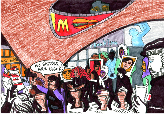 © Виктория Ломаско После Брайтон-Бич немедленно хотелось вернуться в центр Бруклина. Я отправилась на митинг в поддержку black trans women — за последние два месяца в Америке были убиты семь таких женщин. Митинг проходил у входа в Barclays Center. Там, среди молодежи всех цветов и всех национальностей с плакатами и барабанами, неожиданно почувствовала себя как дома — как в лучшие моменты протестов 2012 года, как на «ОккупайАбай».