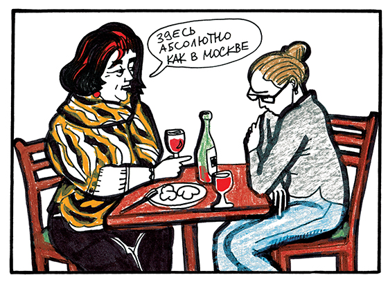 В Америке постоянно вспоминаются «Марсианские хроники» Рэя Брэдбери: переселенцы на Марс пытаются притвориться, что еще живут на Земле (в Европе, в Китае, в Мексике, в России?), но получается так себе. Из витрин Брайтон-Бич на меня таращились матрешки, поблескивала продукция Гусь-Хрустального… Внимание привлекло объявление «Требуется женщина с опытом работы для ЛЕПКИ пельменей и вареников», и я решила поесть в этом заведении. В меню нашлись и пельмени, и вареники, и борщ, и плов, и хинкали. На большой плазменной панели показывали каких-то российских звезд. Пожилая дама-завсегдатай, видимо, уже не в первый раз восторженно сообщила официантам, что здесь крайне удачно скопирована атмосфера московских кафе, но я и на минуту не смогла забыть, что нахожусь на другом материке.