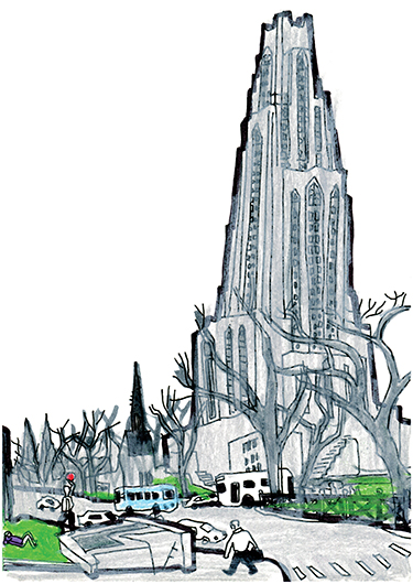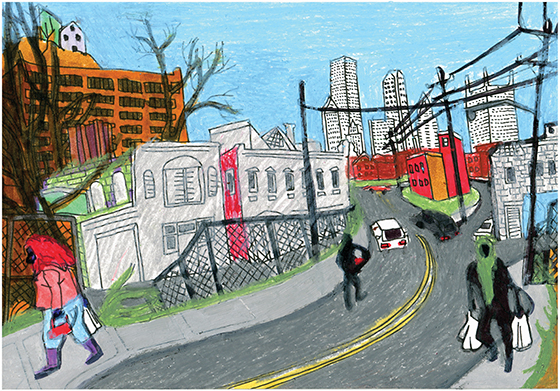 Мой дом стоял на границе престижного района и трущоб, можно сказать, гетто. Когда в 80-е в Питтсбурге стали закрываться сталелитейные заводы и началась безработица, больше половины жителей уехало. В дешевые или вовсе брошенные дома заселились афроамериканцы. Я попробовала зарисовать границу между старым Downtown и новым центром, построенным, когда Питтсбург стал возрождаться.