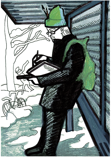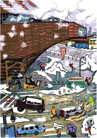 © Виктория Ломаско На выходе со станции Hoyt Schermerhorn обычно очень оживленно, но в этот день только редкие пешеходы брели по проезжей части. Кое-где попадались люди, которые пытались разгрести сугробы лопатами. «Жаль, что у меня нет шубы, чтобы рисовать сейчас на улице», — подумала я и тут же увидела художника, который стоял и рисовал заснеженный город. Я подошла поближе. От него хорошо пахло травой. Он сказал, что его зовут Дейл, он работает иллюстратором в офисе, но сегодня часть транспорта не ходит и у него, как у многих других ньюйоркцев, выдался незапланированный выходной. Дейл смотрел на заснеженный Нью-Йорк, его потерянных жителей… и рисовал абстракцию! Ну никакого соцреализма в Америке.