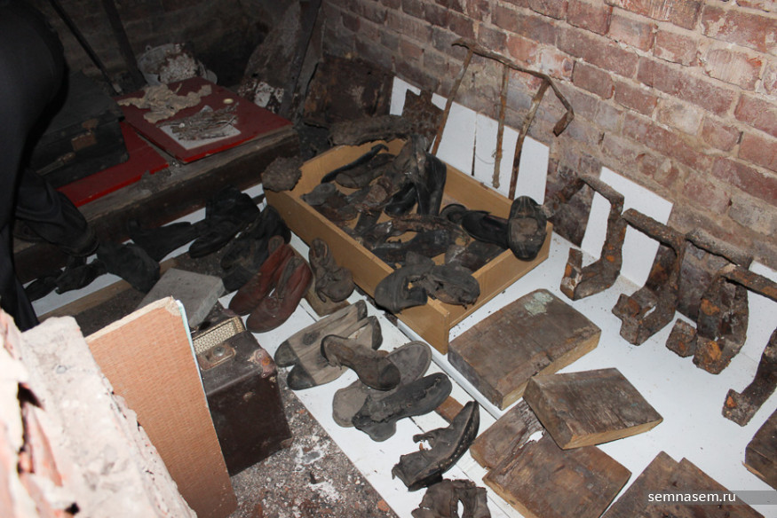 Вход в подвал прорубили на новом месте, он не совпадает с несколькими старыми, в свое время заколоченными. О том, где они располагались, можно судить по спускающимся в подземелье крутым деревянным лестницам. По словам Аракчеева, во время противопожарной и санитарной очистки чердаков и подвалов от мусора волонтеры обнаружили множество находок тех времен: монеты, гильзы, несколько десятков пар старой обуви, осколки стеклянных кабинетных табличек и даже фуражку сотрудника НКВД с сине-красным околышем. Многие из предметов разместили в подвальной экспозиции.