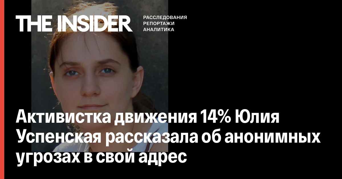 Активистке движения 14% Юлии Успенской поступают смс-сообщения с угрозами. Об этом она рассказала The Insider. По словам Успенской, к угрозам могут быть причастны провластные движения НОД или SERB. После второго сообщения активистка подала заявление в полицию. В сообщении говорилось: «Если ты, сучка, не успокоишься, у тебя начнутся проблемы, у твоих друзей и твоих близких».