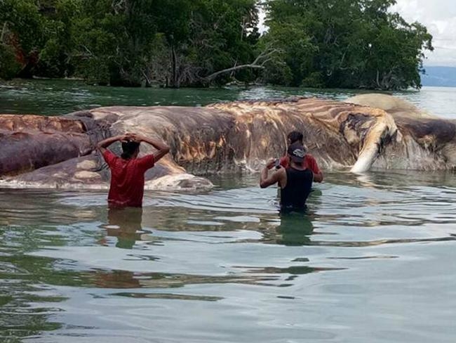 Рыбаки из индонезийской провинции Малуку опубликовали несколько фотографий и видео 15-метрового морского существа. По словам местных жителей, они сначала приняли его за лодку, которую выбросило на берег.