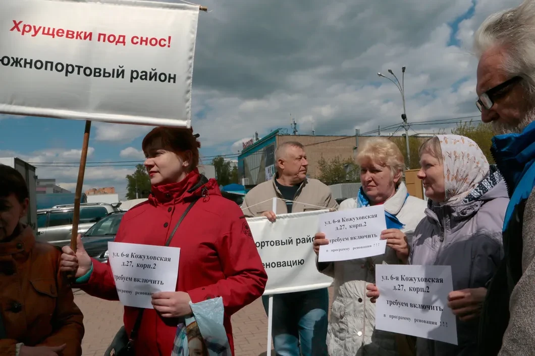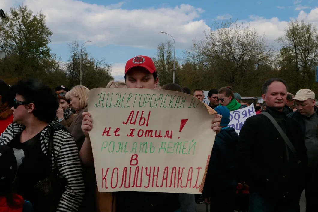 Москвичи на митинге против сноса пятиэтажек, который прошел в воскресенье на проспекте Сахарова. Фото: Виктория Одиссонова/ «Новая газета»Жители района Нагатино-Садовники: «Мы узнали в апреле, что наши дома могут попасть под реновацию - тут же собрали подписи, написали письма. Надеемся, что наш дом не включили именно поэтому. Вокруг нас все остальные сталинки включили». Фото: Виктория Одиссонова/ «Новая газета»Участники митинга против реновации с кукольным домиком в виде пятиэтажки. Фото: Виктория Одиссонова/ «Новая газета»«Мой дом не попал под первую волну. Но у знакомого будут сносить точно такой же дом, как мой. Я не знаю, почему», — Ирина, жительница района Филевский парк. Фото: Виктория Одиссонова/ «Новая газета»Москвичи на митинге против сноса пятиэтажек. Фото: Виктория Одиссонова/ «Новая газета»Жители Южного Тушино на вопрос об исправности коммуникаций в домах отвечают: «Если у жены мэра сломается зуб, он же не будет менять жену? То же и с трубами внутри домов». Фото: Виктория Одиссонова/ «Новая газета»Москвичи на митинге против сноса пятиэтажек. Фото: Виктория Одиссонова/ «Новая газета»Плакаты протестного митинга. Фото: Виктория Одиссонова/ «Новая газета»Участники митинга кричат «Защитим жильё от жулья!». Фото: Виктория Одиссонова/ «Новая газета»Фото: Виктория Одиссонова/ «Новая газета»