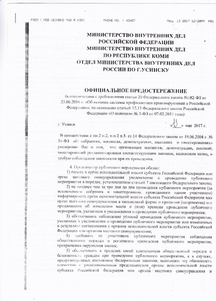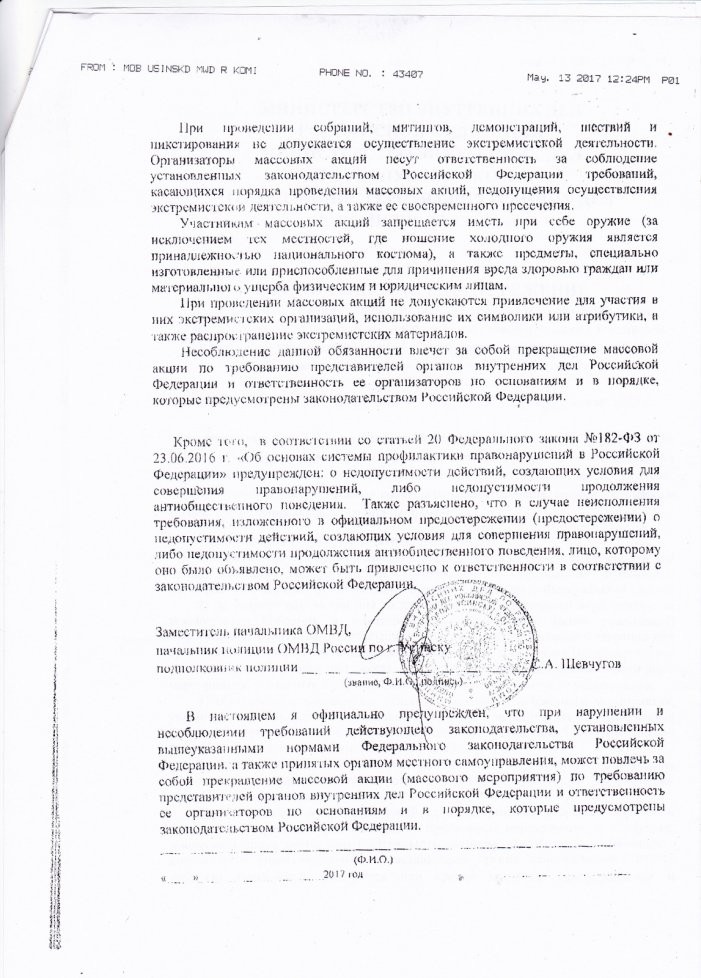 Организаторы устранили формальное нарушение, отправили в администрацию дополнение. 12 мая активисты Комитета спасения Печоры (КСП) Иван Иванов, Екатерина Дьячкова и Валерий Братенков обратились в полицию и прокуратуру Усинска, чтобы уточнить, можно ли проводить митинг. В полиции им сообщили, что акция не согласована администрацией, а в прокуратуре — что ситуация не совсем ясна. Екатерина Дьячкова подала заявление в прокуратуру о незаконном противодействии мирному собранию граждан.