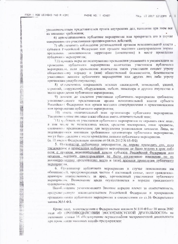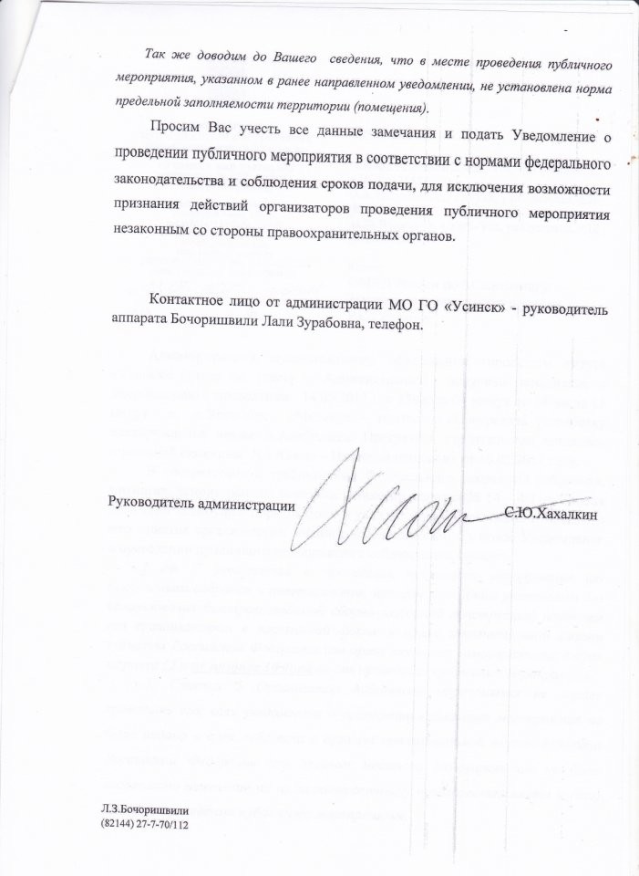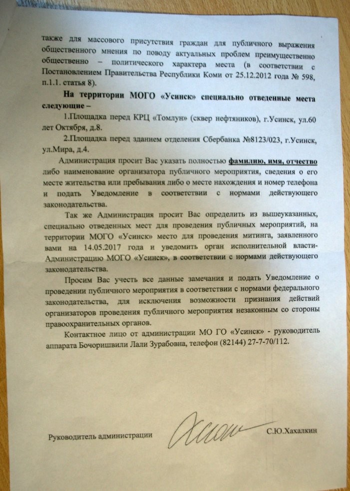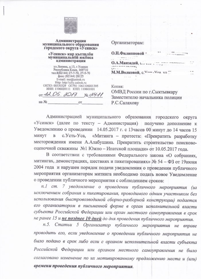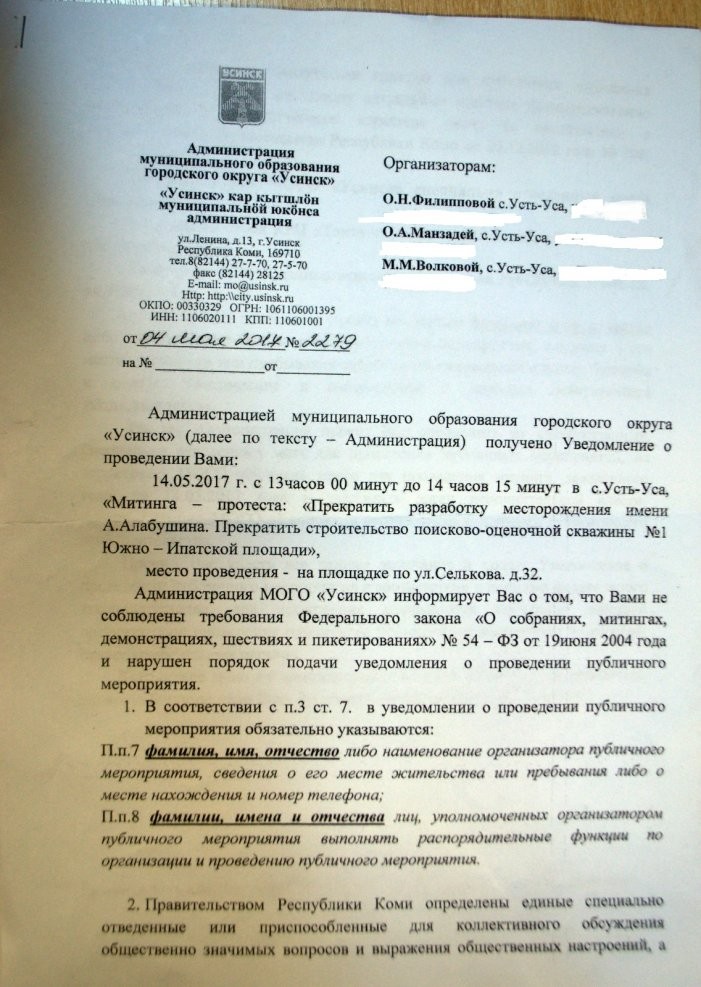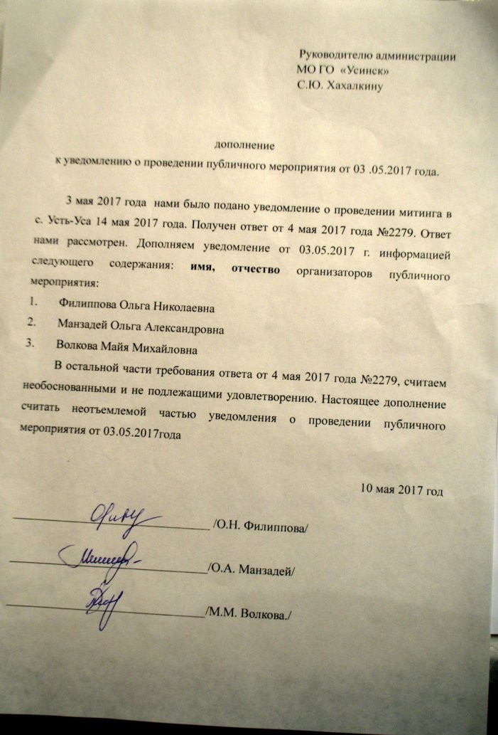 Уведомления о проведении митингов жители деревни Новикбож и села Усть-Уса подали 4 мая. Однако администрация Усинска нашла нарушения — вместо полных имен и отчеств организаторов указаны инициалы.