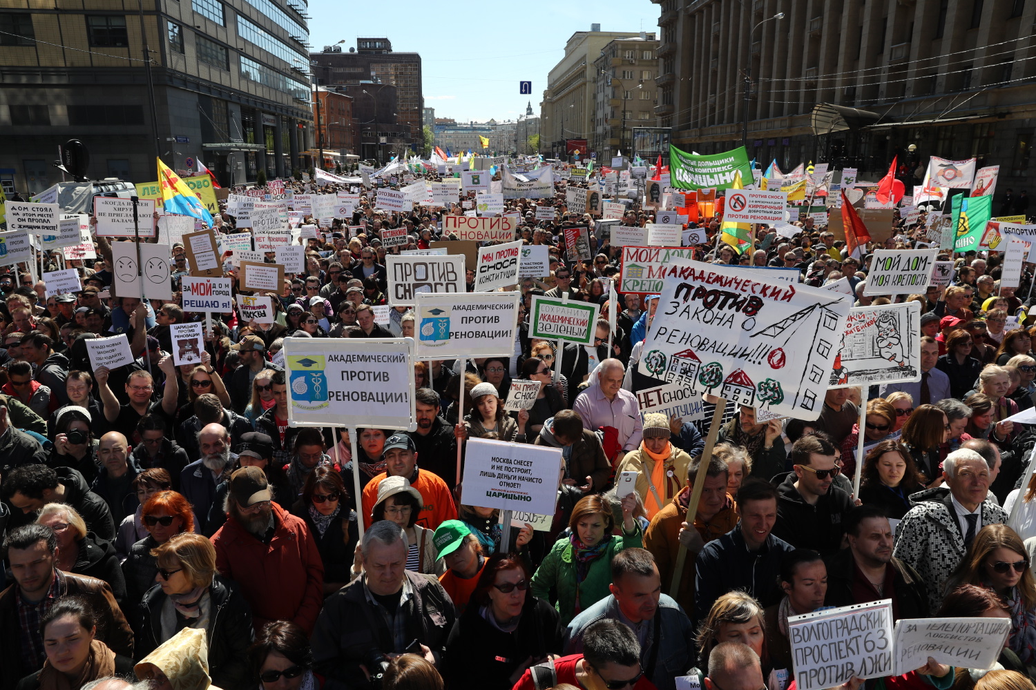 14 мая в Москве прошел митинг против программы реновации — сноса домов и расселения их жильцов. На акции, по данным организации «Белый счетчик», собрались более 20 тысяч человек