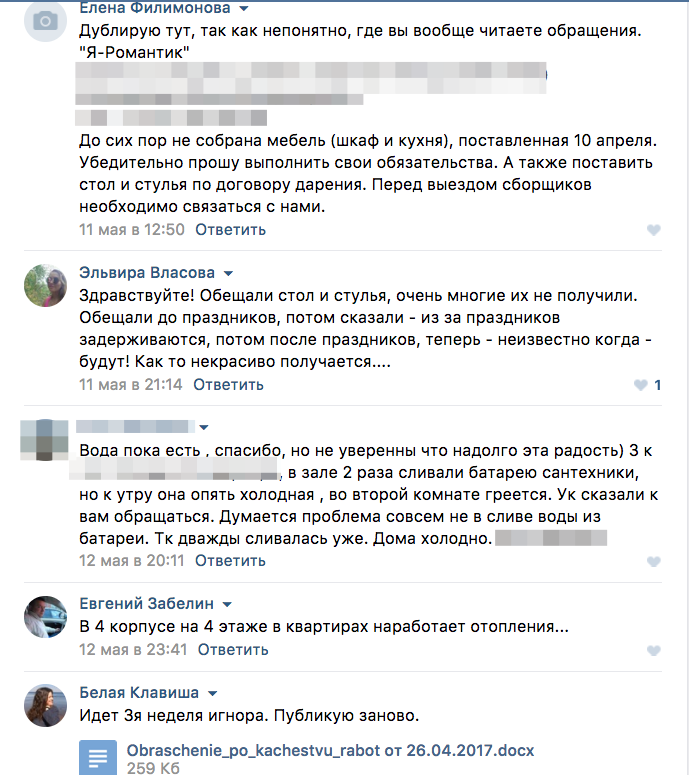 Как рассказывают покупатели квартир, раньше они обсуждали все неприятности с ЖК в «независимой» группе во «ВКонтакте». Однако в марте, как они утверждают, Seven Suns выкупила группу у владельца, забанила недовольных, а посты и комментарии с критикой удалила. Сейчас в ней состоит больше 5 тысяч человек, которые в основном просят советов по ремонту и стройматериалам.