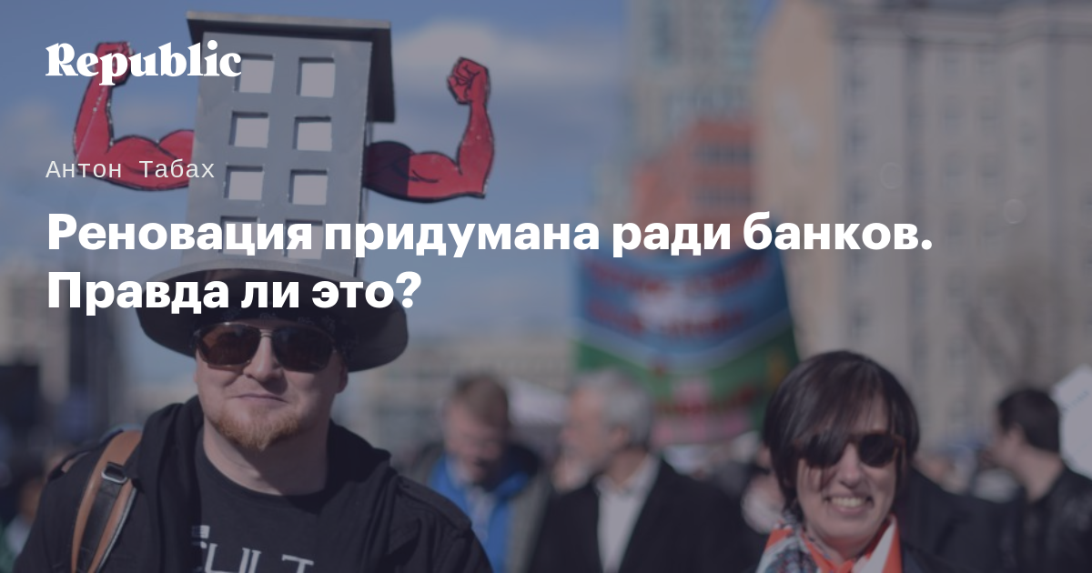 «Реновация задумана не для расселения хрущевок, а для спасения банковской системы», – гласил один из тезисов протестного митинга 14 мая в Москве. Действительно: на месте снесенных домов построят новые, город выделит на это 300 млрд рублей на первые три года (из отведенных на реновацию 20 лет), и это позволит загрузить работой строительный комплекс, который с 2014 года переживает тяжелые времена. Зачем мэрии помогать застройщикам, с которыми у нее сложные отношения? Конечно, чтобы спасти банки, рассуждают люди. Ведь банки либо владеют крупнейшими застройщиками и девелоперами со всеми их убытками последнего времени, либо выдали им много кредитов под залог слабозаселенных жилых комплексов.
