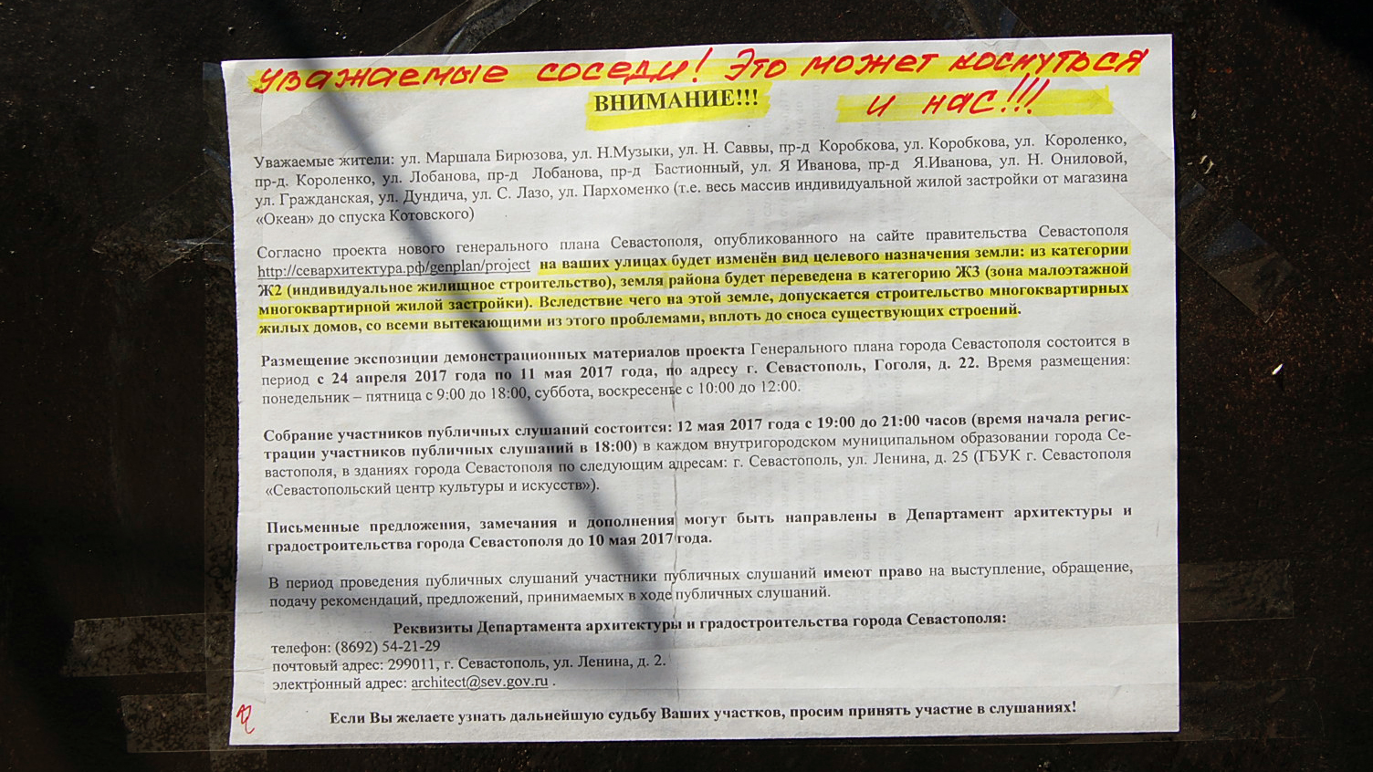 Еще несколько месяцев назад о готовящейся «перестройке» города и переделе местной земли почти никто ничего не знал: команда московских архитекторов втихаря рисовала новый «генеральный план», ущемляющий права местных жителей, а российское правительство Севастополя практически ничего не сообщало людям о готовящихся изменениях.