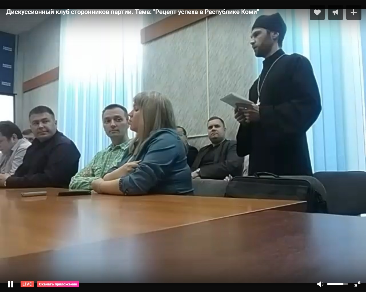 А сейчас уже открыто священники Сыктывкарской епархии поддерживают партию Единая Россия и присутствуют на дискуссиях их сторонников, тем самым подтверждая, что они сторонники определенной политической партии.