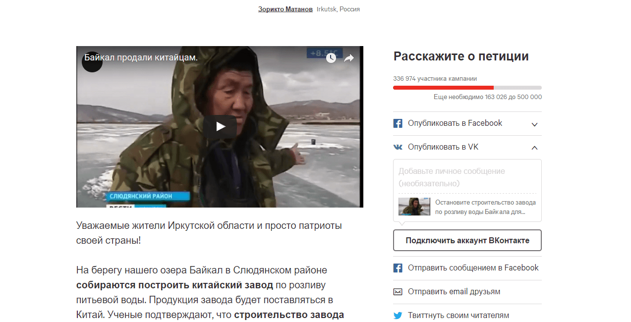 4. Петиция против строительства завода по розливу воды Байкала для Китая. На данный момент самая популярная петиция на Change.org. Дело в том, что на берегу озера Байкал собираются построить завод, продукция которого будет поставляться в Китай. По словам ученых, строительство завода навредит озеру и повлечет масштабные экологические проблемы. Под петицией ней подписались почти 337 тысяч человек. Она будет отправлена в Минприроды России и губернатору Иркутской области Сергею Левченко.