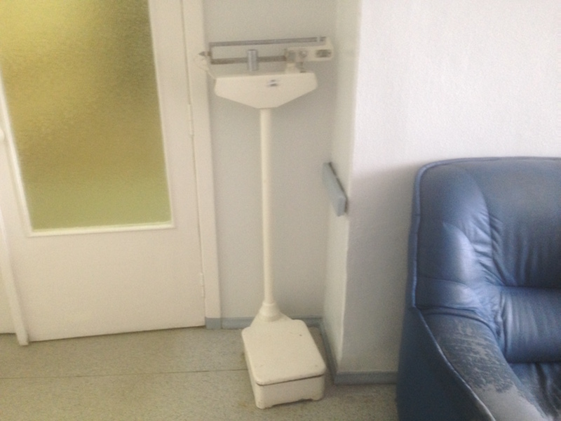 Вернусь к своей палате, медсестра с поста ушла, можно фотографировать тайное. Кстати, оказалось что на всё хирургическое операционное отделение есть три медсестры и старшая (или всего три?). Должность врача отделения не предусмотрена (считается, что больных наблюдают хирурги, которые их ведут), но по этой же причине отсутствует и... дежурный врач! То есть - что случись у больного после операции, здесь ему врач не поможет. Медсестре надо будет либо бежать километр с больным к каталке, либо бежать километр по переходам за врачом, и потом ещё километр обратно. А платят медсестре в "платном" отделении с недостатком санитарок... 15 тысяч рублей. Круть. Кстати, в мою последнюю ночь ночным дежурным был... студент. Студент молодец, но - чёрт! - разница между дежурным врачом и студентом поразительна.... У первой палаты "выделен уголок" для имитации "приёмного отделения", состоящего из антикварного ростометра