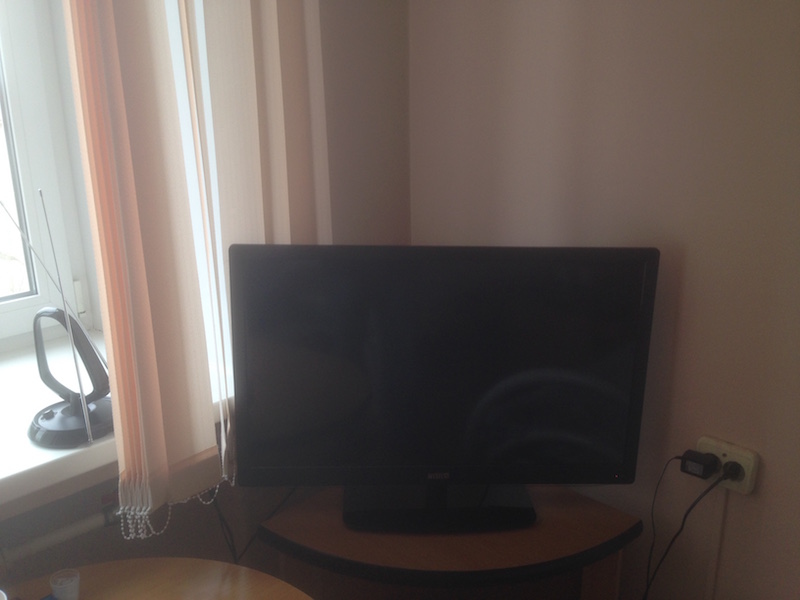 Пойду в палату, там тоже весело. Там есть телевизор с плохой выносной антенной, поэтому он показывает лишь один канал, да и тот исключительно в сером цвете. Кстати, пульт от телевизора не работал - батарейки сели.