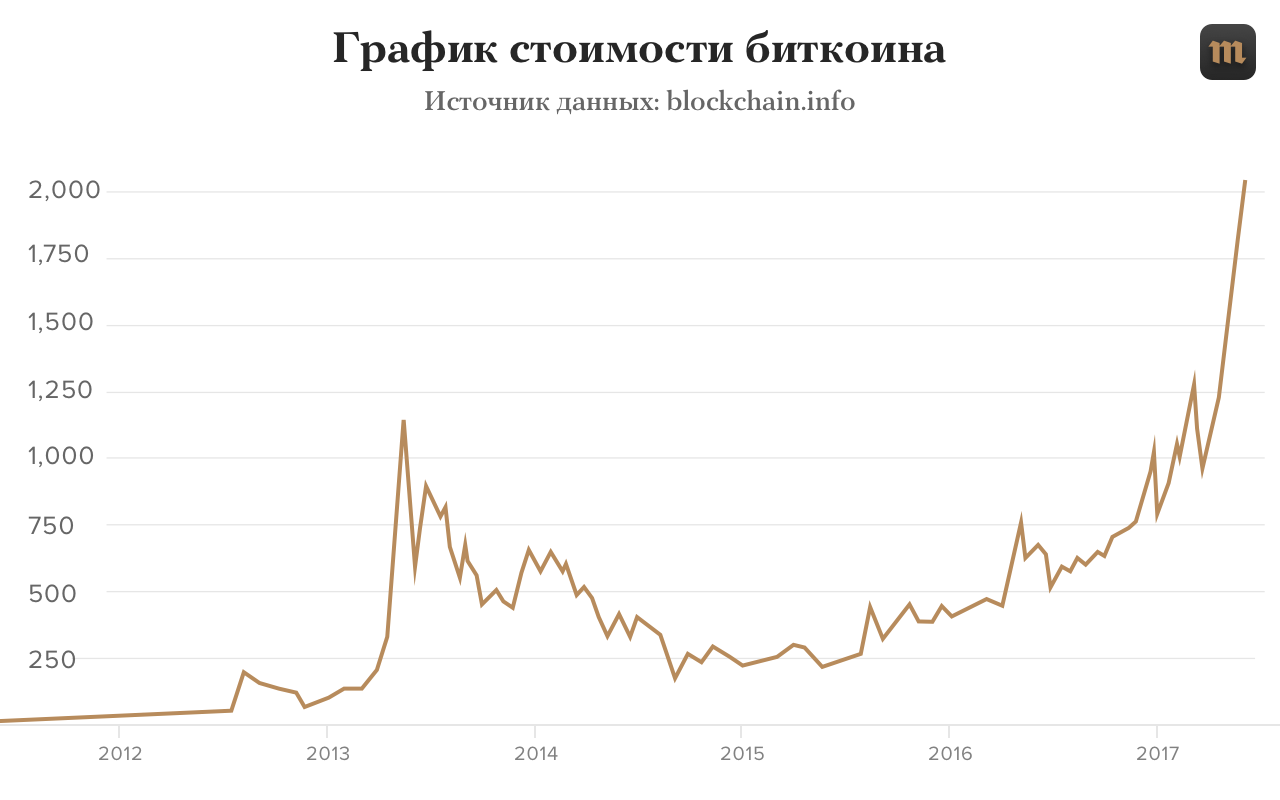 Биткоин резко дорожает с конца марта. За недолгий век существования криптовалюты биткоин редко когда приближался к отметке в тысячу долларов, а всю первую половину прошлого года колебался в пределах 400–600 долларов. Рост курса начался в августе прошлого года и с небольшими перерывами продолжается до сих пор. Отметку в тысячу долларов биткоин преодолел в январе 2017-го, затем подрос до 1200 долларов, к концу марта обвалился обратно к тысяче — и с тех пор показывает рекордный рост, иногда прибавляя по 100–150 долларов за день. Что-то подобное в истории криптовалюты происходило лишь однажды — в 2013 году, когда за месяц курс биткоина вырос со ста долларов почти до тысячи.