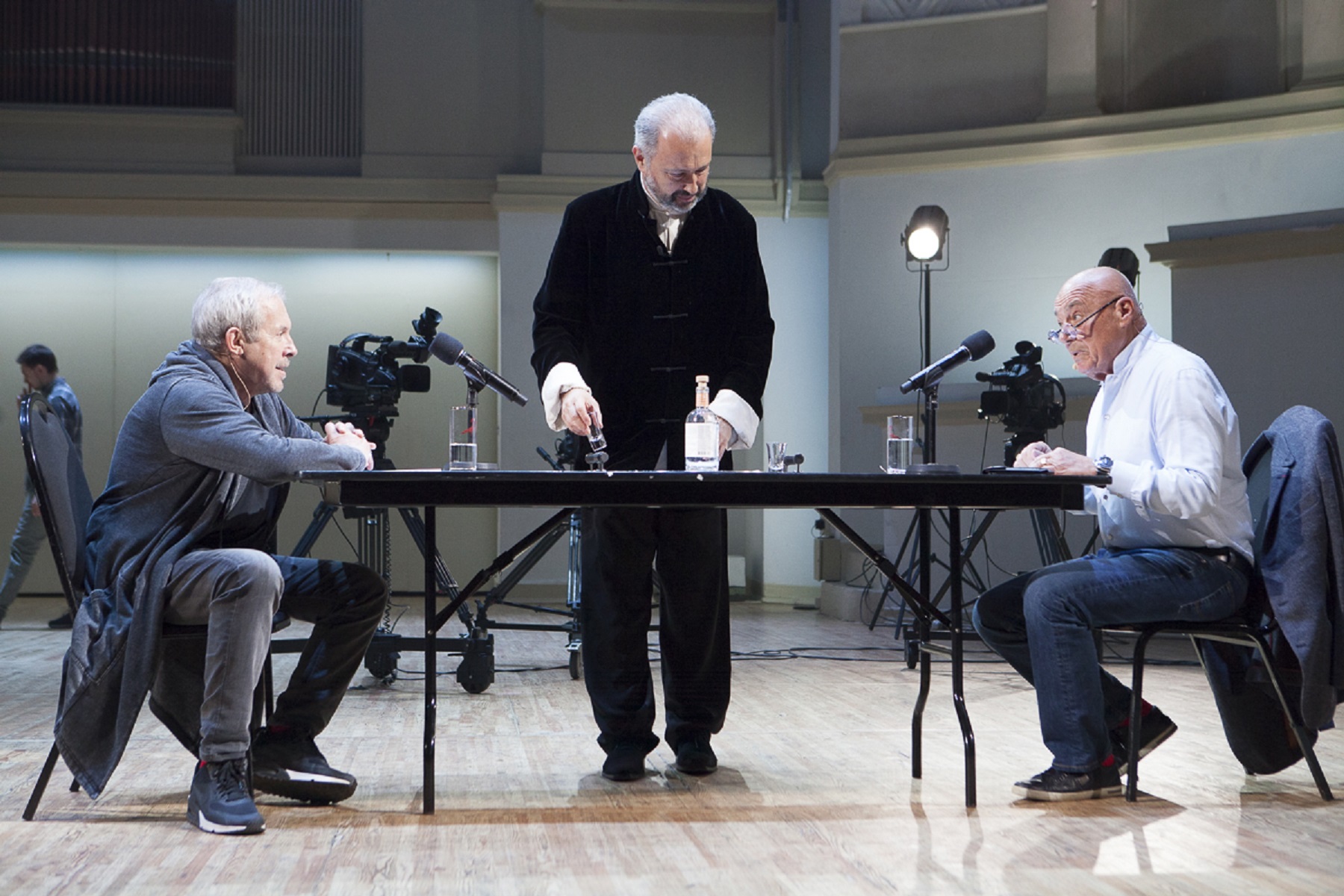 В спектакле, поставленном к 135-летнему юбилею Игоря Стравинского режиссером и хореографом Михаилом Кисляровым, главные роли играют не профессиональные актеры, а люди, известные в совсем других ипостасях: телеведущий Владимир Познер (Рассказчик) и рок-музыкант и художник Андрей Макаревич (Солдат). Другие участники — Полина Осетинская (фортепиано), Игорь Федоров (кларнет), Антон Плескач (ударные), танцовщики Александр Тронов и Анна Дельцова. Скрипач и дирижер Дмитрий Ситковецкий — исполнитель роли Черта, а также автор идеи спектакля и его музыкальной версии — рассказал NT, как появился на свет этот сложносоставной проект.