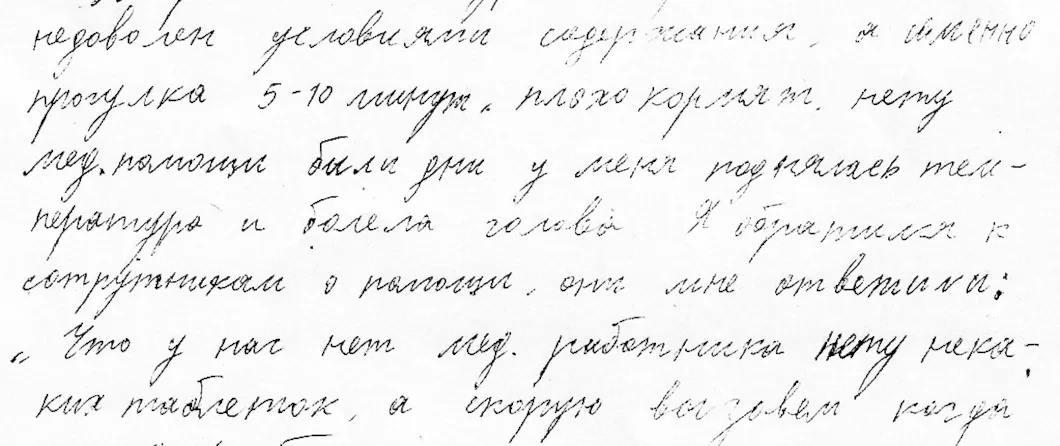 «Прогулка 5–10 минут. Плохо кормят. Нету медпомощи. У меня сломанная рука, ночами мучаюсь не могу спать»