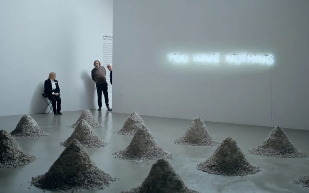 У Эстлунда отличная фантазия и сумрачный юмор. В поле его острого зрения оказываются и сами деятели контемпорари (чего стоит сыгранная Элизабет Мосс арт-критик Ани, проживающая с шимпанзе в качестве перманентного перфоманса, или парочка рекламщиков, умеющих из любой нелепицы сварганить хит для Youtube), и радикальные произведения. Кучки из гравия под неусыпной охраной смотрительницы, случайно втягивает пылесос уборщика — приходится срочно искать на улице дорожный гравий…
