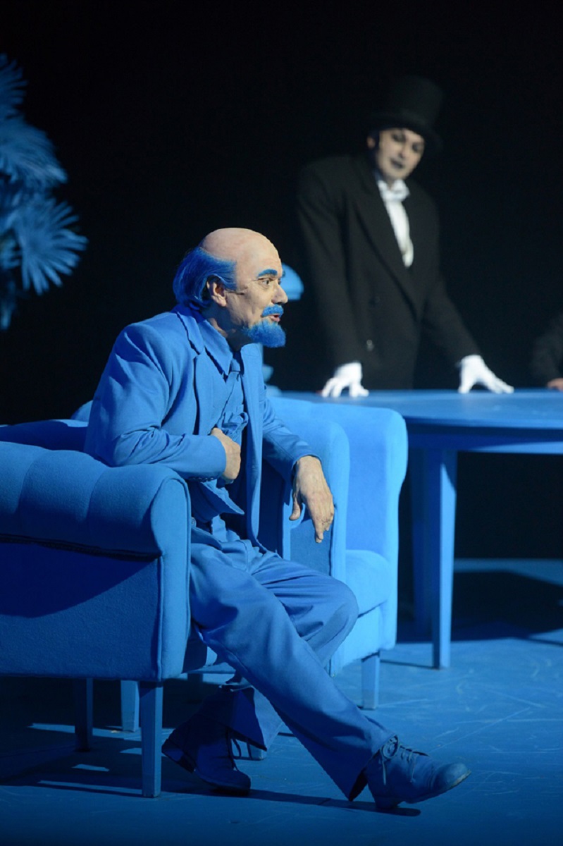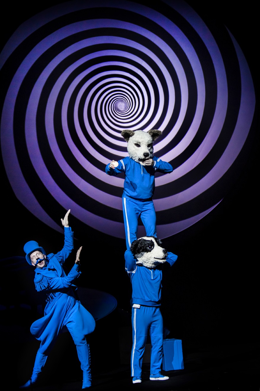 Независимо от того, с каким художником работает Диденко, в его спектаклях огромную роль играют цвета: в «Земле» по одноименному фильму Александра Довженко, визуально оформленном как спортивное состязание, команда красных противостояла команде синих, пантомимический «Идиот» был полностью выдержан в красно-черно-белой гамме, а в недавней постановке «Чапаева и Пустоты» каждому из трех актов соответствовал свой цвет. В «Цирке» доминирует синий, цвет неба: для Диденко мечта о полете — важнейшая тема фильма («Мэри верит в чудеса, Мэри едет в небеса», — поет героиня Орловой). Спектакль почти такой же монохромный, как и черно-белая картина Александрова: костюмы, парики, бороды, столы, стулья, цветы в горшках, еда и даже львы — синим тут бывает абсолютно все.