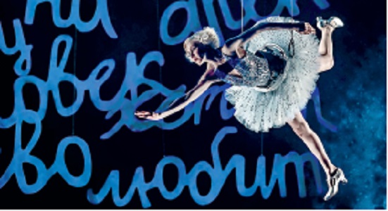 У круглого экрана — своя захватывающая жизнь. Иногда это громадное, потрясающе правдоподобное небесное тело — то манящая героев луна, то инфернальное черно-оранжевое солнце. Иногда — окно в Москву будущего, какой ее представляли советские архитекторы и футурологи: с летающими машинами и Дворцом Советов. А порой — крупный план актера в реальном времени (видеохудожник Илья Старилов добавил к черно-белому изображению эффект старой пленки, чтобы было похоже на оригинальный фильм, — мелочь, а приятно). Без экрана была бы невозможна дивная сцена, цитирующая «Полет над городом» Марка Шагала: Мэри со своим русским возлюбленным Мартыновым лежат на манеже, он поет ей «Песню о Родине», камера снимает их сверху — а на видео две живые фигурки плывут над футуристической Москвой.