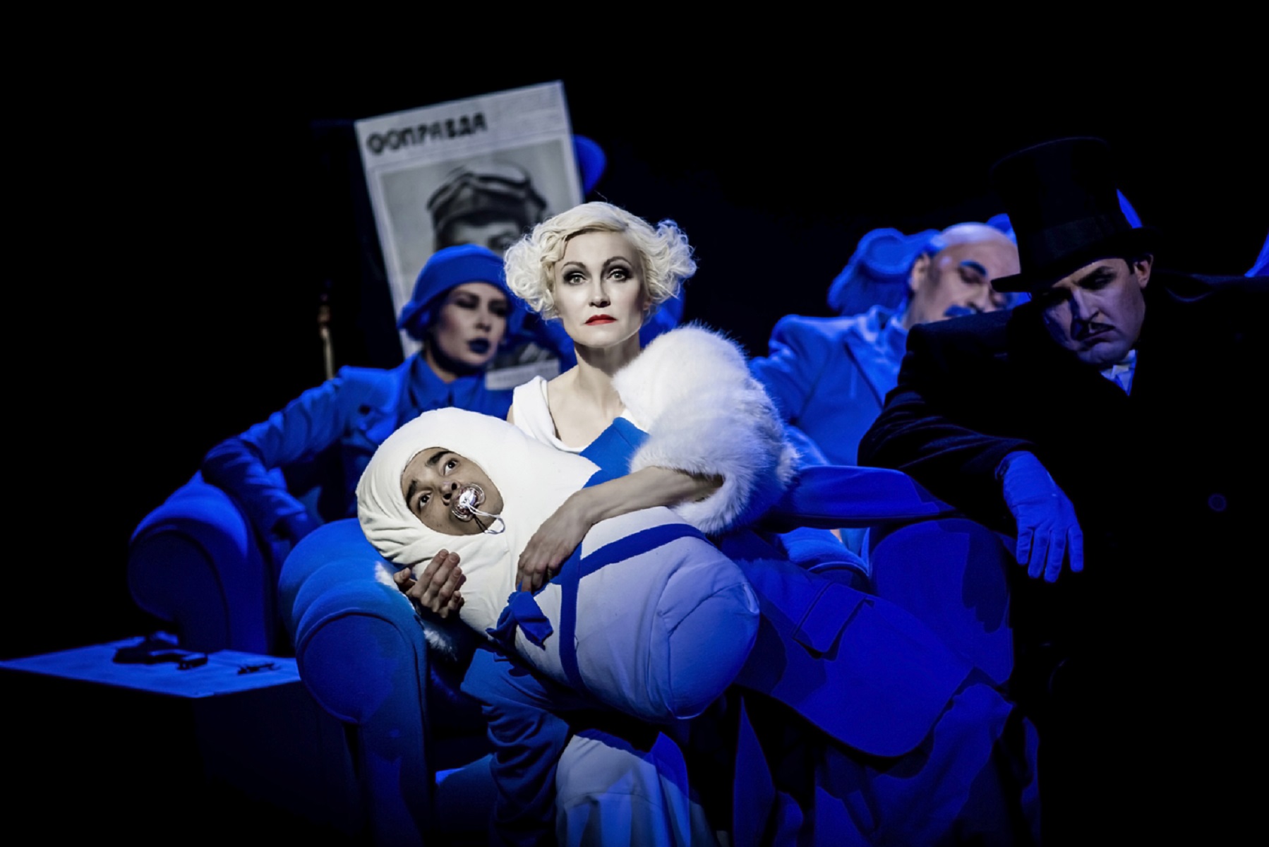 Из оригинального «Цирка», в сущности, мало что понятно о героях, их индивидуальностях, их мотивах, их прошлом, да даже об их работе, которая вынесена в название фильма: это история не о людях, а о преимуществах одной системы над другой. В спектакле дают выговориться по крайней мере двум персонажам — акробатке Мэри (Ингеборга Дапкунайте) и конструктору-самоучке Скамейкину (Роман Шаляпин). Мы можем лишь гадать, как Мэри-Орлова реагировала на ненависть соотечественников-расистов, понимала ли она, что ей нечего стыдиться, — в пьесе же Мэри-Дапкунайте произносит в свою защиту исчерпывающий монолог (да еще и на камеру), направленный не только против расизма, но и против гомофобии, которая при Сталине была закреплена в Уголовном кодексе. А Скамейкин, который в кино был классическим комичным недотепой, здесь, в театре, стал «маленьким человеком», работающим из страха наказания.