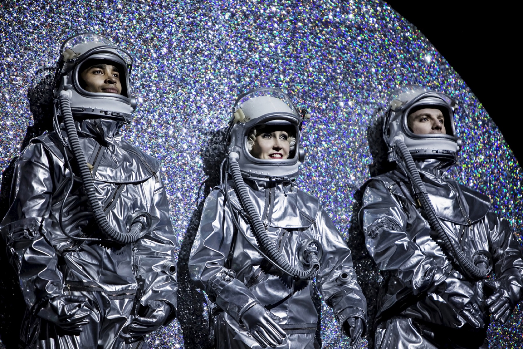 Это не единственное место, где инсценировка, написанная Диденко на пару с драматургом Константином Федоровым, расходится с оригинальным сюжетом. У Александрова советские цирковые артисты просто старались повторить американский «Полет на Луну». Герои спектакля куда амбициознее: чтобы утереть капиталистам нос, они решают полететь на настоящую Луну. Цирк переформируется в ЦИРК — Центр исследования русского космоса, акробаты готовятся к первому космическому полету, а конструктор-любитель Скамейкин, которому раньше не приходилось делать ничего сложнее пушки для циркового трюка, становится пионером ракетостроения. В итоге на Луну отправляются трое: Мартынов, Мэри и растущий не по дням, а по часам Джимми. Чем не хеппи-энд? Вот только это зрелище — три беспомощных фигуры в скафандрах, намертво приклеенных к серебряному лунному диску над сценой, — подозрительно напоминает Голгофу. Или липкую ленту для мух — кому что ближе. Потому что люди в русском космосе — исходящий реквизит.