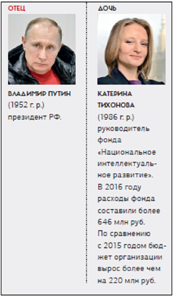 Путиномика — система государственно-монополистического капитализма, основанная на корпоративных и семейных узах, — приобретает все новые черты. Причем в буквальном смысле этого слова: дети крупных госчиновников и силовиков вне зависимости от их реальных талантов и способностей делают карьеры, занимают руководящие позиции в госкомпаниях либо в компаниях, аффилированных с государством. Непотизм (или в просторечии — кумовство) был характерной чертой системы власти в царской России, порицался в России советской, расцвел пышным цветом во времена позднего СССР и достиг небывалых размеров за годы президентства Владимира Путина. NT продолжает (см. «Все лучшее детям!» в № 21 от 20 июня 2011 года и «Все лучшее детям — 2» в № 6 от 23 февраля 2015 года) присматривать за детьми путинской элиты*