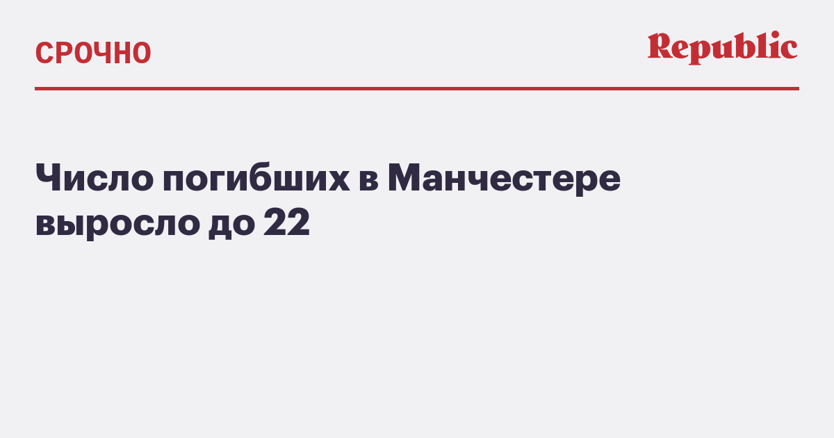 Число жертв взрыва в Манчестере выросло до 22 человек. Об этом сообщает Reuters со ссылкой на полицию.