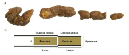 Внутренние стенки пищеварительного тракта покрыты слоем слизи, и, чем ближе к прямой кишке, тем толще этот слой. Кишечная слизь служит смазкой. Поскольку ее вязкость η примерно в три раза меньше, чем вязкость фекалий, последние можно представлять как плотную колбаску, скользящую по кишке подобно салазкам по желобу.