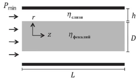 Наконец, покончив с видеосъемками, измерениями и лабораторными экспериментами, исследователи составили математическую модель дефекации. Модель представляет прямую кишку как трубку, в которой находятся цилиндрические фекалии диаметра D и общей длины L, разделенные на несколько фрагментов (рис. 3). Стенки трубки покрыты слоем слизи толщиной h, которая существенно меньше D.