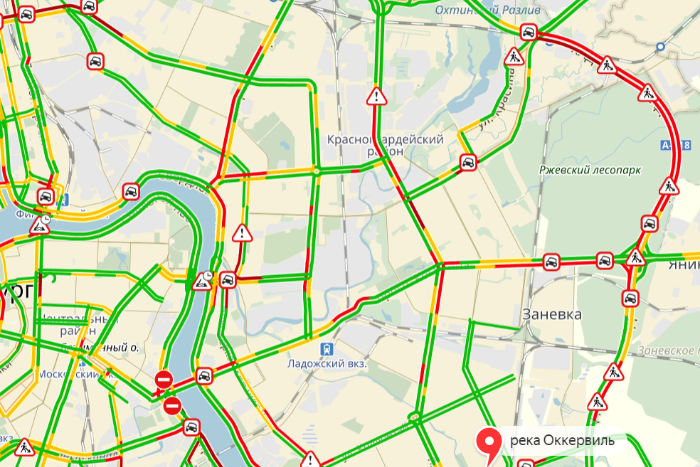 Утром 24 мая на внутреннем кольце КАД образовалась многокилометровая пробка. По данным «Яндекс.Пробки», к 7:30 длина затора, который тянулся от Рябовского шоссе до реки Оккервиль, составляла 9 километров.