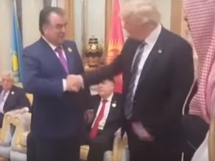 Приветствуя Трампа, Рахмон отреагировал на его энергичное рукопожатие, известное как «дергай и тащи», дернув руку американского лидера к себе. В итоге приветствие Рахмона и Трампа, скорее, напоминало перетягивание каната.