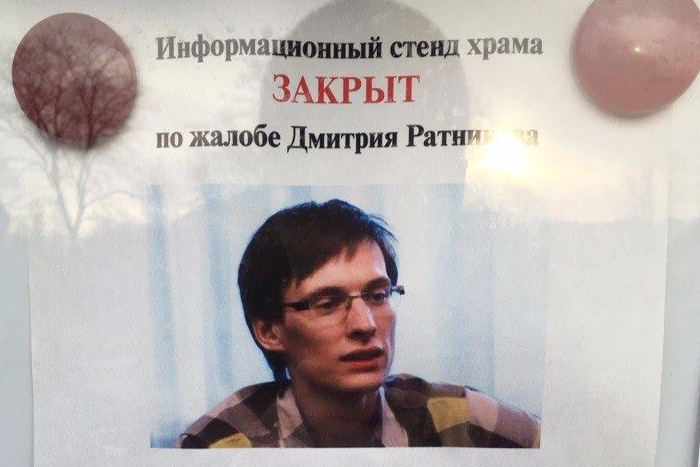 Главный редактор петербургского издания «Канонер» Дмитрий Ратников рассказал, что на стенде у церкви в парке Победы вывесили его фотографию. Это произошло после того, как журналист пожаловался чиновникам на информационную конструкцию храма.