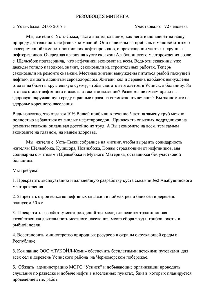 17 мая на митинге в селе Щельябож выступающие потребовали извинений от президента НК «Лукойл» Вагита Алекперова.