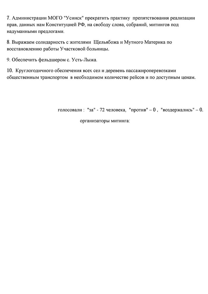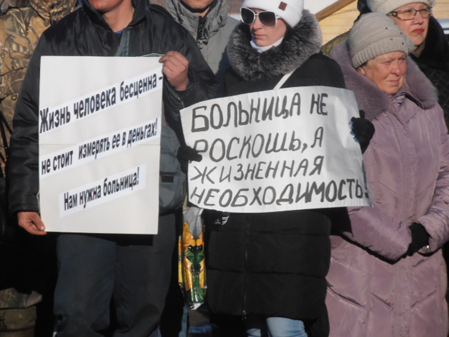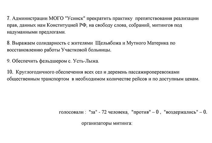В Мутном Материке митинг собрал 72 человека, они потребовали восстановить круглосуточный стационар в участковой больнице села. Местный житель Анатолий Канев напомнил, что в Коми ежегодно происходят десятки крупных и мелких аварий на объектах нефтепромыслов и нефтепроводах.