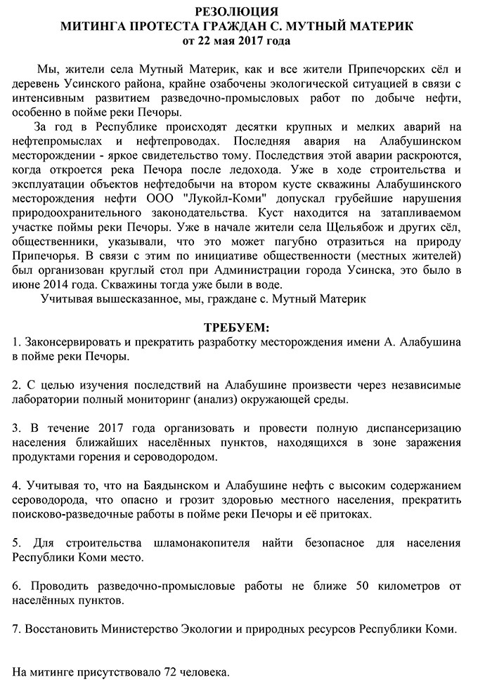 Как и щельябожцы на акции 16 мая, жители Мутного Материка потребовали закрыть все скважины месторождения им. Алабушина, поскольку считают их опасными для населения и реки. Они боятся, что «Лукойл» будет сопротивляться выполнению этого требования, так как это грозит серьезными финансовыми потерями. По словам Канева, месторождение опасно из-за высокой концентрации токсичного газа сероводорода: в небольших объемах он вызывает головокружение, головную боль, тошноту, а при значительной концентрации приводит к коме, судорогам, отеку легких и даже смерти.